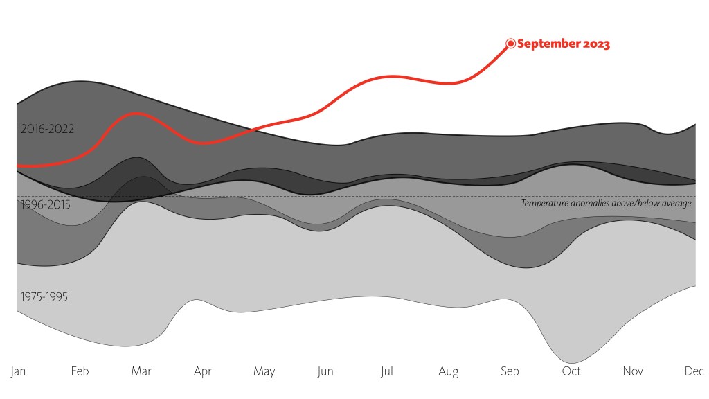 Heat waves and soaring temperatures have recently run amok. In June, July, and August 2023, the planet shattered global heat records month after month, but the latest numbers from September 2023 are even more alarming when we compare them to historical global temperature anomalies from the past 50 years. In the Northern Hemisphere, we tend to think about the summer being the hottest season, with the sun at its apex and the extended hours of daylight. But it’s clear these temperature spikes are not limited to the hottest summer months.